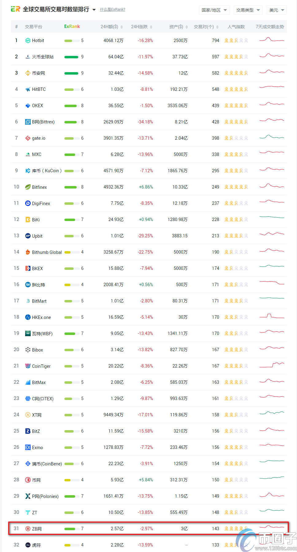 按照交易对数量来排名,中币交易所排第31名,其交易对数量为143个。