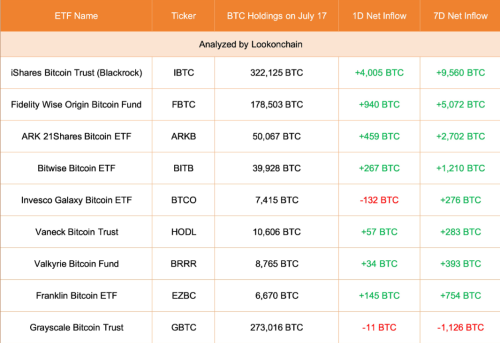 7月18日财经报道,据 Lookonchain 监测, 7 月 17 日美国现货比特币 ETF 数据显示:贝莱德增持约 4005 枚比特币,价值约 2.6046 亿美元,当前持有 322125 枚比特币,价值约合 209.5 亿美元;灰度减持 11 枚比特币,价值约合 72.8 万美元,当前持有 273016 枚比特币,价值约合 177.5 亿美元;9 只比特币 ETF 总计增持 5763 枚比特币,价值约合 3.748 亿美元。
