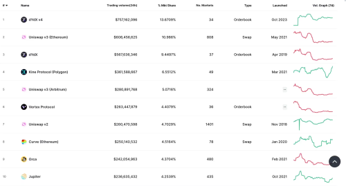 数据显示,基于 Coos 的 v4 版本 dYdX 在 24 小时内的交易量刚刚达到 7.57 亿美元,超过了 Uniswap v3,后者的交易量为 6.08 亿美元。dYdX 的 v3 市场仍在运营,价值 5.67 亿美元,足以排名第三。