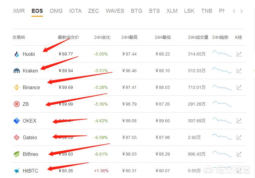 如上图所示,箭头所指示的方向就是支持EOS这种数字货币的平台,但是它们具体靠不靠谱那谁也不敢说,只能说选择那些比较知名度比较高的交易所,风险会低一些而已。