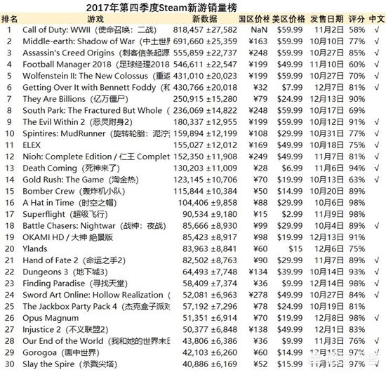在近日Steam2017年第四季度销售额中,中国玩家成Steam主要购买力。根据榜单信息,SteamCN论坛网友ErivRan制作了2017年第四季度Steam发售新游销量榜前30的表格。其中,共有21款新游拥有中文,前6名当中甚至全部自带中文,而前十名中也只有2款产品没有中文。中国玩家大批涌入Steam,成为第一大用户群体,并且在购买力上也逐渐展示实力,也是让众多厂商侧目的根本原因。