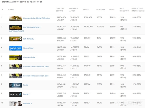 2017年第四季度,去年10月3日截止到今年1月1日在Steam上所有游戏的销售排名。Steam共卖出了1.35亿份游戏。游戏平均价格为4.83美元,约合人民币31元,平均折扣幅度为4.9折。Steam销售额约为6.52亿美元,折合人民币42.36亿元。其中,《CS:GO》仍然占据着销量总榜第一名的位置,累计销量为3800万份上下,2017年第四季度销量约为359万份。而排名第二的《绝地求生》累计销量为2600万份左右,中国的累计销量就接近1000万份。
