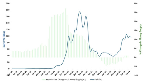 美国货币供应量(M2)和DeFi TVL