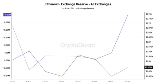 根据CryptoQuant数据,目前各大交易所钱包中所持有的以太币数量合计达1,900万枚,价值约470亿美元,较上周增加1.01%,创下8月22日以来的最高水平。
