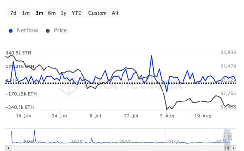 此外,以太币大户「净流量」出现下降,这同时表明「巨鲸」们也采取了看空立场。自8月初以太币价格跌破3,000美元以来,这些大户就逐步在减持以太币。