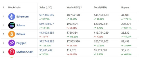 NFT 排名前十的区块链上周的 NFT 买家数量都有所增加,其中 Solana 以 220,304 个 NFT 买家位居榜首。Polygon以89498个买家位居第二,而以太坊网络则有44188个买家。