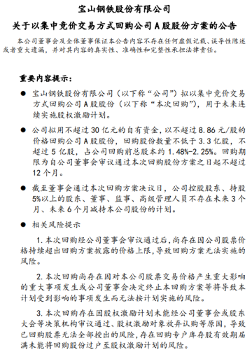 宝钢股份:拟用不超30亿元自有资金回购A股股份 更新时间:2024-12-07 03:31:23 •阅读 0 宝钢股份(600019)10月16日晚间公告,拟用不超过30亿元的自有资金,以不超过8.86元/股的价格回购公司A股股份,回购股份数量不低于3.3亿股,不超过5亿股,占公司回购前总股本约1.48%-2.25%。