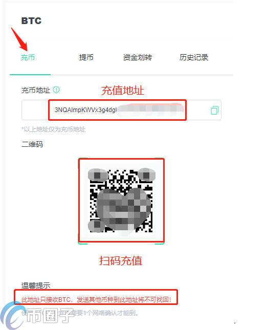 还可以扫描二维码,并使用对应资产转出(提现)平台的手机客户端来扫描二维码,进行充值。