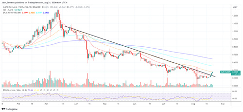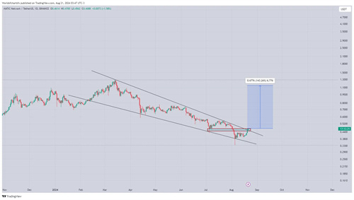 昨天,8月20日,Polygon价格突破了这个下行通道,这可以被认为是一个主要的看涨信号,表明之前的下行趋势可能结束。MATIC的突破是至关重要的,因为它不仅代表了市场情绪的转变,而且为潜在的价格目标设定了新的轨迹。