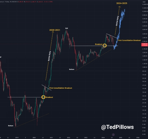 不过,尽管当前市场形势严峻,但仍有乐观的声音存在。一些加密货币交易员和历史图表分析人士认为,以太坊价格可能在未来某个时间点迎来突破。例如,知名交易员Ted在8月11日的帖子中预测:“整合突破将发生在2024年11月/12月,而抛物线运行将在2025年第一季度开始。”这一预测为投资者提供了一丝希望,但市场走势仍需进一步观察。