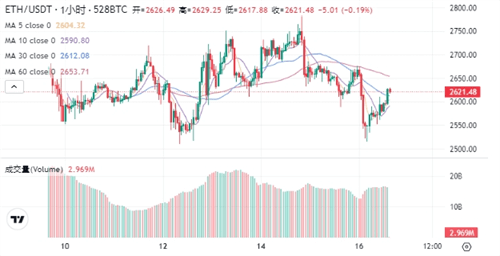 据最新的行情数据显示,以太坊的最新价格为:$ 2,620.67,在当前的24小时内以太坊的价格下跌:-1.71%,24小时最高价格为:$2,675.40,24小时最低价格:$2,515.43。