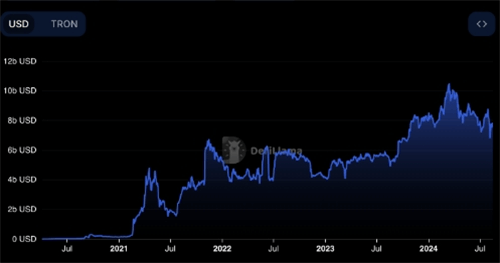 然而,在光鲜亮丽的成绩背后,Tron也面临着一些挑战。DefiLlama的数据显示,尽管TRX代币价格在2024年6月实现了9.5%的显著上涨,但Tron的总锁定价值(TVL)却在同期降至约76亿美元的六个月低点。尽管7月份有所回升至约87亿美元,但8月份又回落至约76亿美元附近,显示出市场对其价值的波动态度。