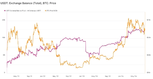 回顾历史,Tether在交易所的余额增减往往与市场行情紧密相连。在熊市期间,USDT储备的增加通常反映了交易者将高风险加密货币转换为稳定币以避险的行为;而在牛市期间,USDT的积累则可能预示着交易者正在为潜在的市场回调储备资金,以便在低价时买入更多加密资产。