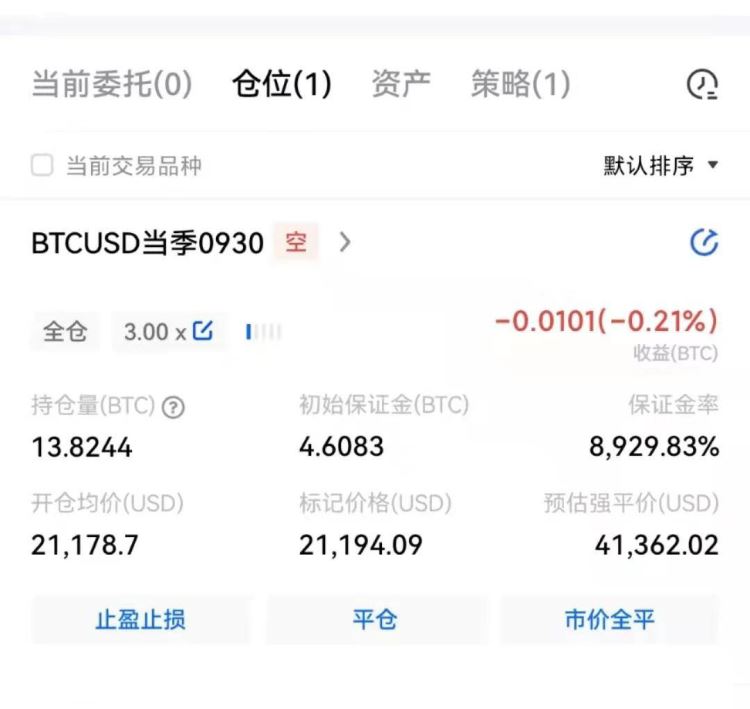 4.挂单成交后,可在持仓界面中可查看订单的相关数据,例如保证金、收益、收益率、预估强平价等。