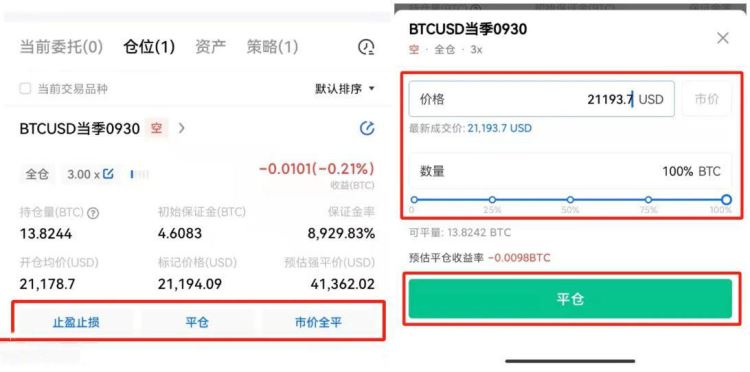 5.您可在持仓界面设置止盈止损,还可选择平仓,输入平仓价格和平仓数量确定平仓,或选择市价全平完成平仓操作。
