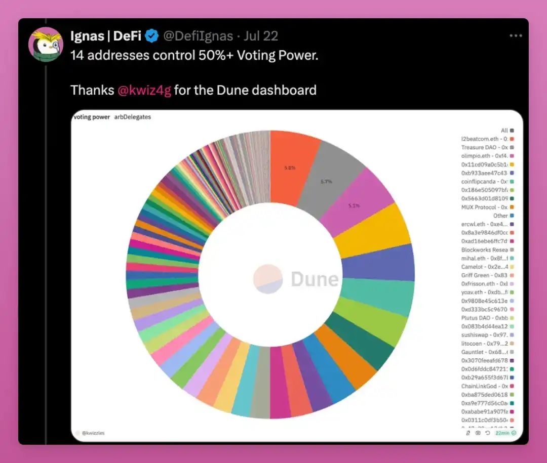 DAO 倡导去中心化组织的愿景,但现在大多数 DAO 都远未实现去中心化,这已是公开的秘密。例如,在 Arbitrum DAO 中,14 个地址控制着超过 50% 的投票权,其他 DAO 也一样。