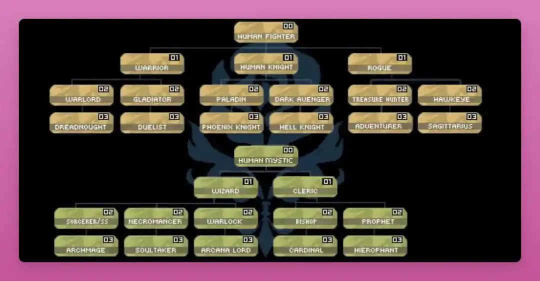 在 天堂 2 中,你可以选择一个种族(人类、精灵、兽人等)和职业(战士、神秘主义者)。
