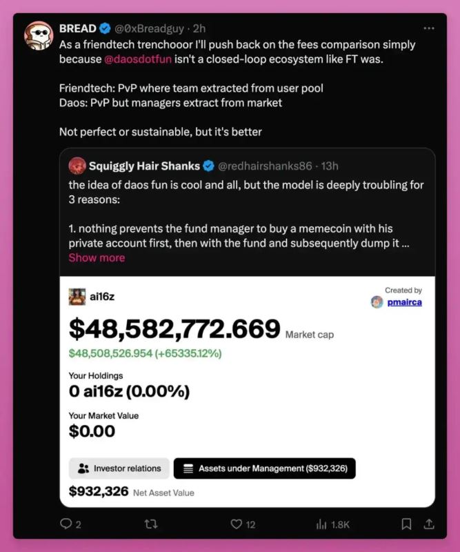 玩家们都在试图理解它。Squiggly 将该基金比作「Grayscale 结构」或 Friend.tech 交易费庞氏骗 局。BREAD 对 Friend.tech 部分持不同意见。