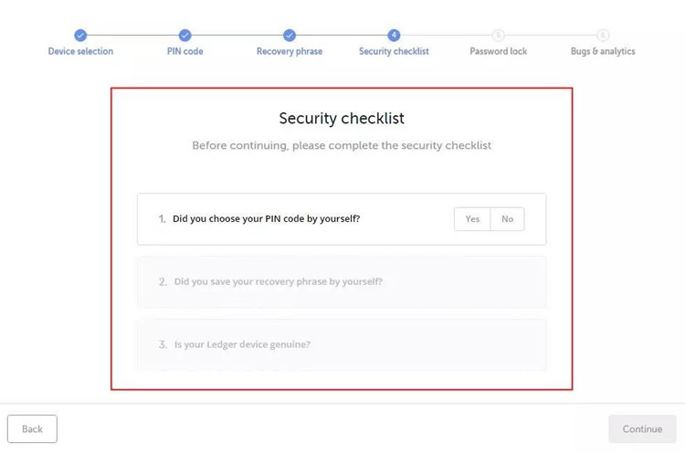 第一次使用Ledger Live应用程序时,它将指导你完成初始化配置,如果您的设备还没有完成初始化配置可参考 Nano S 设备初始化配置,如果您的设备已经完成初始化配置可以点击“Continue”跳至第四步,如下图。