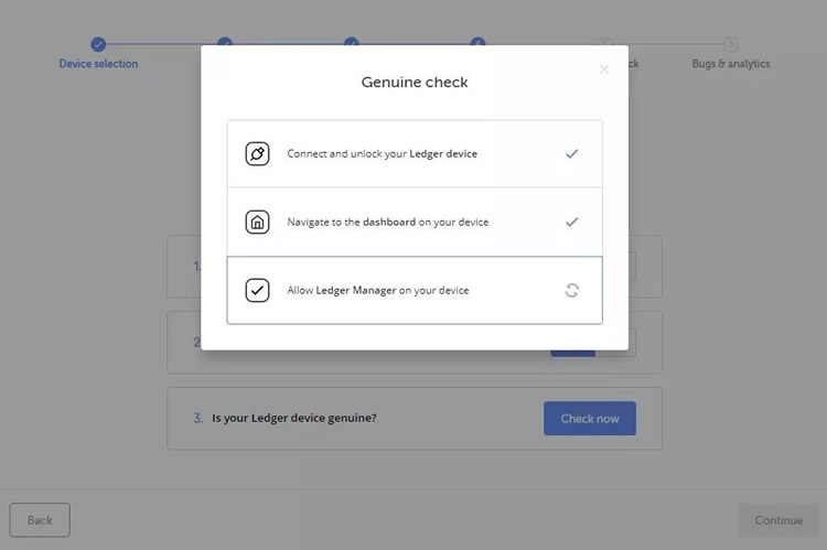 第三个问题中,单击”Check Now”,以验证您的设备是真正的Ledger设备。只有真正的Ledger设备才会有连接Ledger 安全服务的加密证明,否则无法连接Ledger 服务器。