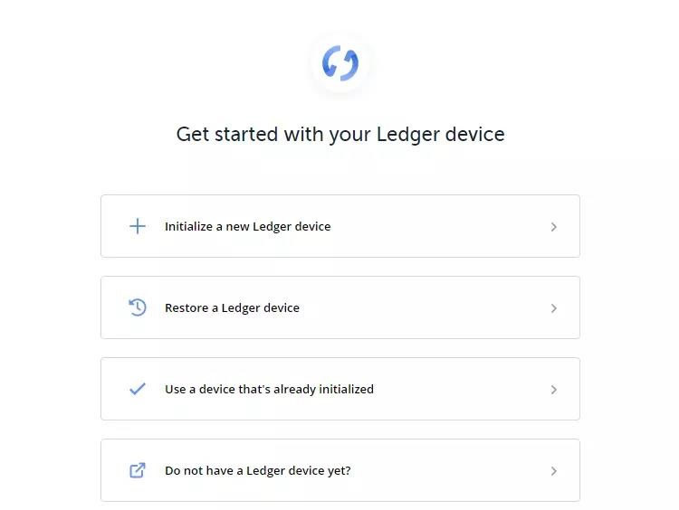如果您的设备刚完成初始化,请选择“Initialize a new Ledger device”;如果你想用助记词来恢复设备,请选择“Restore a Ledger device”;