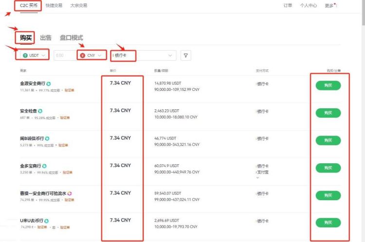 9、进行交易前需要拥有USDT,可在C2C买币进行交易,根据需求选择合适商家,点击“购买”,而后根据提示进行付款、等待商家放币(若是长时间没有收到币种,可联系客服进行处理)