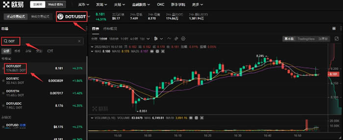5.搜索波卡币简称DOT,点击DOT/USDT交易对,可以看到DOT实时行情。