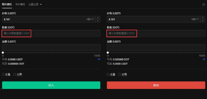 6.填写DOT购买数量,注意最少买入数量为0.1 DOT。