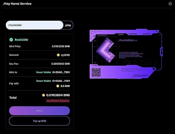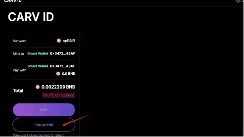 使用钱包登录官网后,会自动生成一个钱包,需要往这个钱包的opbnb网络上充值BNB,充值后铸造CARV ID,注册一个.play域名,成本大概0.8U。