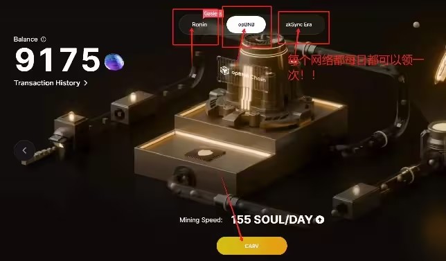 初晓链完善相关信息后,在opbnb链上每日挖矿速度是170SOUL、在zkSync链挖矿速度是240SOUL,每日领取SOUL时,记得切换不同的网络。