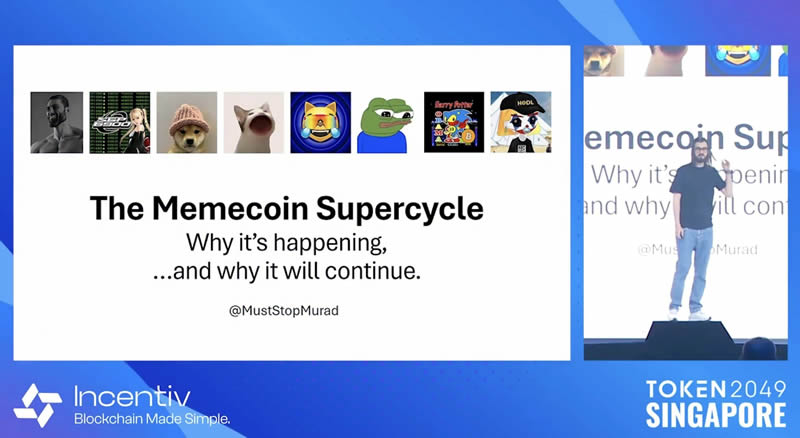 在9 月份的产业盛会Token 2049 上,Murad 做了一场题为《迷因币的超级周期》的主题演讲,将迷因币在本轮周期已经获得的成绩以及后续还将持续发光发热的现状进行了一番极为生动形象的描摹,基于其呈现的丰富翔实的数据以及其极具感染力和煽动性的语言,该演讲也成为了后续加密市场包括散户及机构投资人热议的话题和内容。