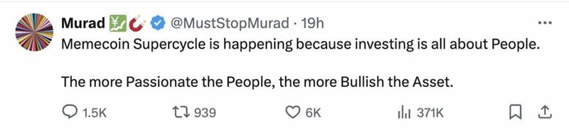 可以说,Murad 是名副其实的「BTC Maxi」、加密OG,而现在,他鼓吹的对象不再是神坛至上的比特币,而是「人人都能参与的」迷因币。