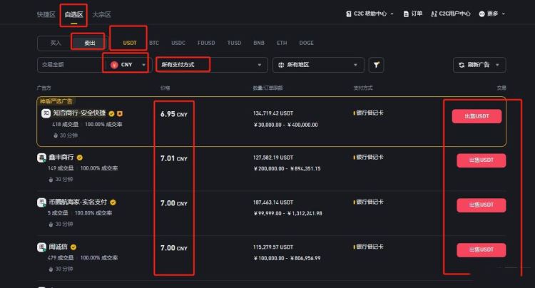 9、根据提示选择“自选区”——“卖出”——“CNY”可以点击所有支付方式筛选支付方式,而后点击“出售USDT”即可