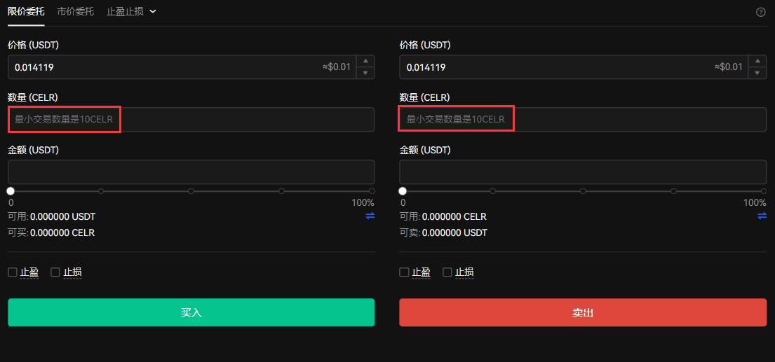 10.填写CELR购买数量,点击买入,若是卖出,填写CELR卖出量,点击卖出即可。注意:CELR最小交易数量是10CELR