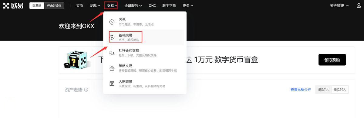 8.登陆欧易OKX账号,在首页点击交易--基础交易,进入交易页面