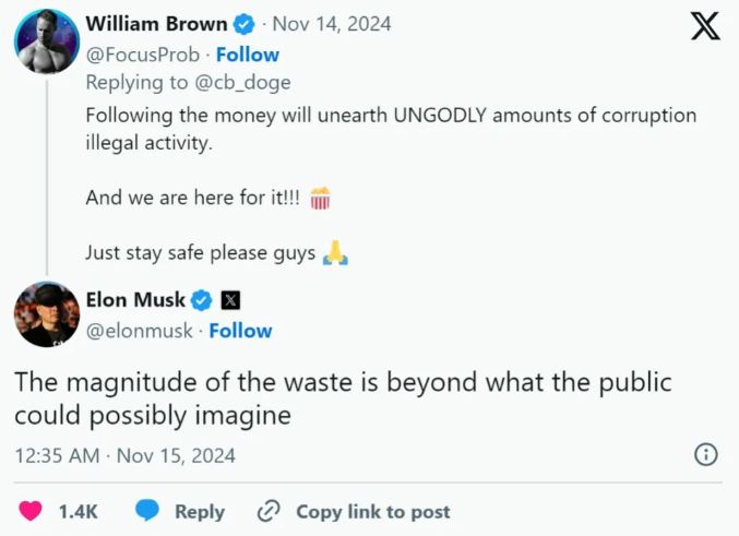 事实上,这源自于马斯克在政治上的一个倡议,即成立一个名为「政治效率部」(Department of Government Efficiency),简称 D.O.G.E,这个计划是他与前总统唐纳德·特 朗普共同发起的一项倡议,旨在对联邦 政府进行全面的财务审计,并提出减少浪费、欺诈和不必要支出的建议。特 朗普在纽约的一次演讲中公布了该计划,这是基于马斯克在 X 上提出的建议。马斯克表示,他愿意参与这一计划,并且不会索取任何报酬或头衔,强调他希望简化政府运作的决心。
