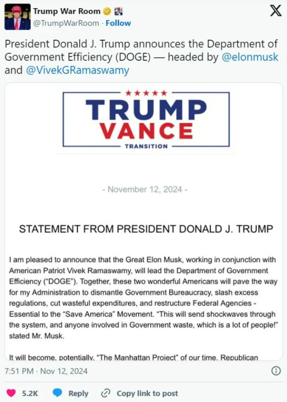 特朗普于周二在一份声明中表示:“埃隆·马斯克和维韦克·拉马斯瓦米将共同为我的政府铺平道路,以拆除政府官僚机构,削减多余的监管,减少浪费性开支,并重组联邦机构——这对于‘拯救美国’运动至关重要。”