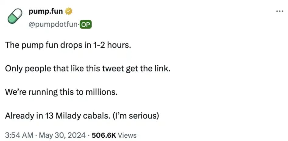 于是打开这批人的推特小铃铛,监控他们的链上地址,是这段时间 meme 玩家重要冲狗依据。这个发现火到 Pump.fun 官方也曾下场玩梗,「已经在 13 个 Milady 阴谋集团中,我是认真的)」。