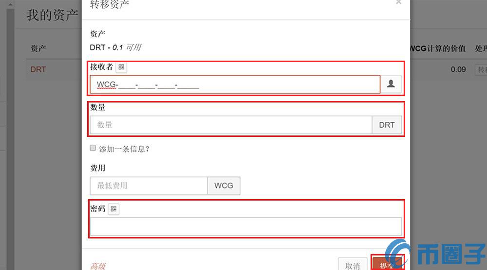 然后点击"提交"按钮。 (备注: 交易费至少是0.01WCG)