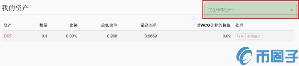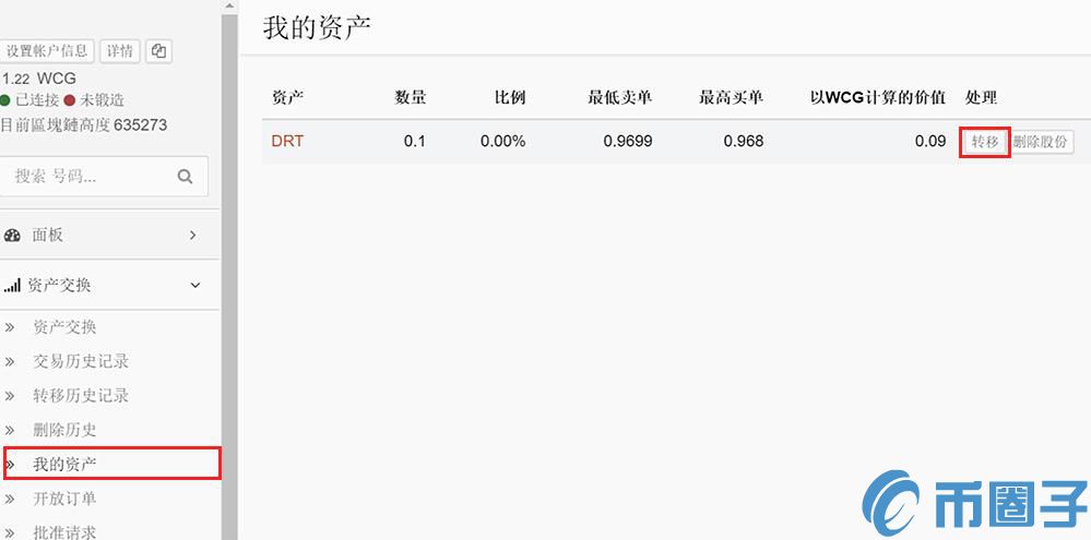 3) 在系统主页,点击资产交换 > 我的资产页面。选择资产DRT。然后按在右边的 "转移" 按钮
