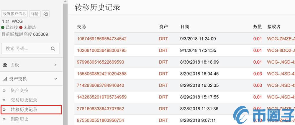 6) 点击资产交换 > 转移历史记录页面,如果交易成功,您将会看到您的交易记录。
