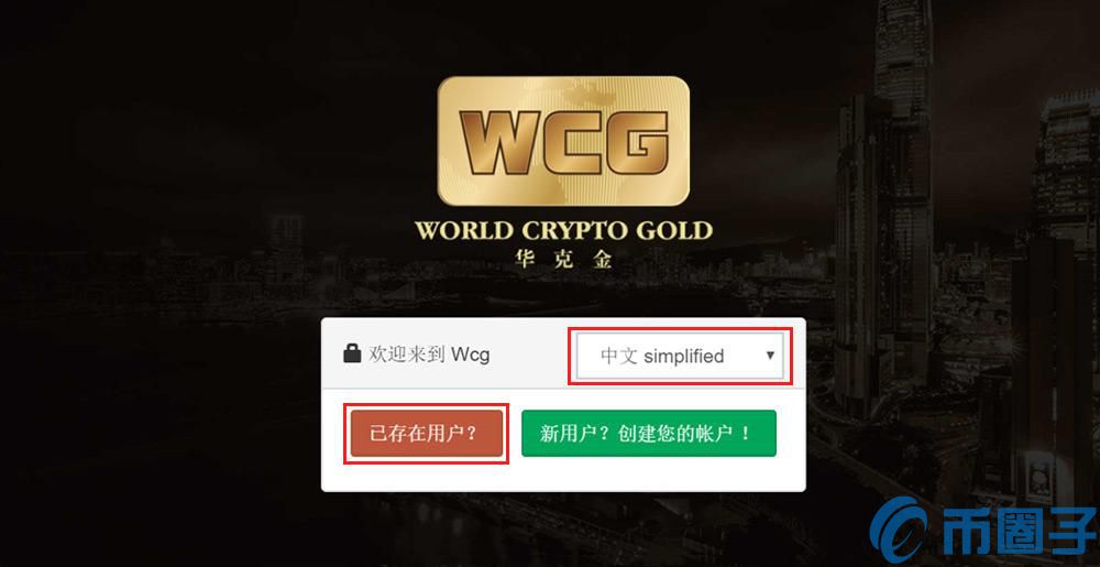1) 打开网址https://wcg.mbaex.com/index.html , 将English改成选择中文simplified,并点击"已存在用户"按钮。