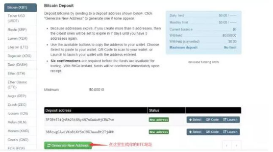11.然后进入下面界面,选择XBT(就是BTC选项),点击绿色按钮生成你的BTC地址。