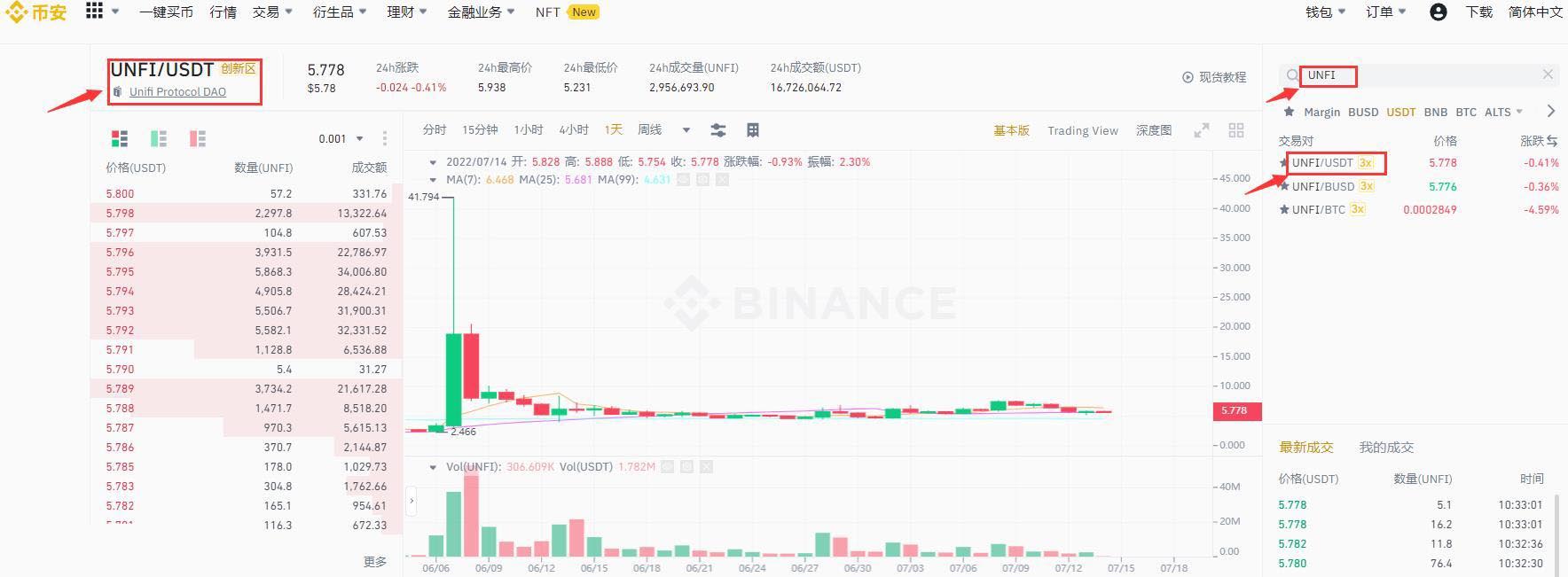 5、在右上角搜索框搜索UNFI,点击UNFI、USDT交易对