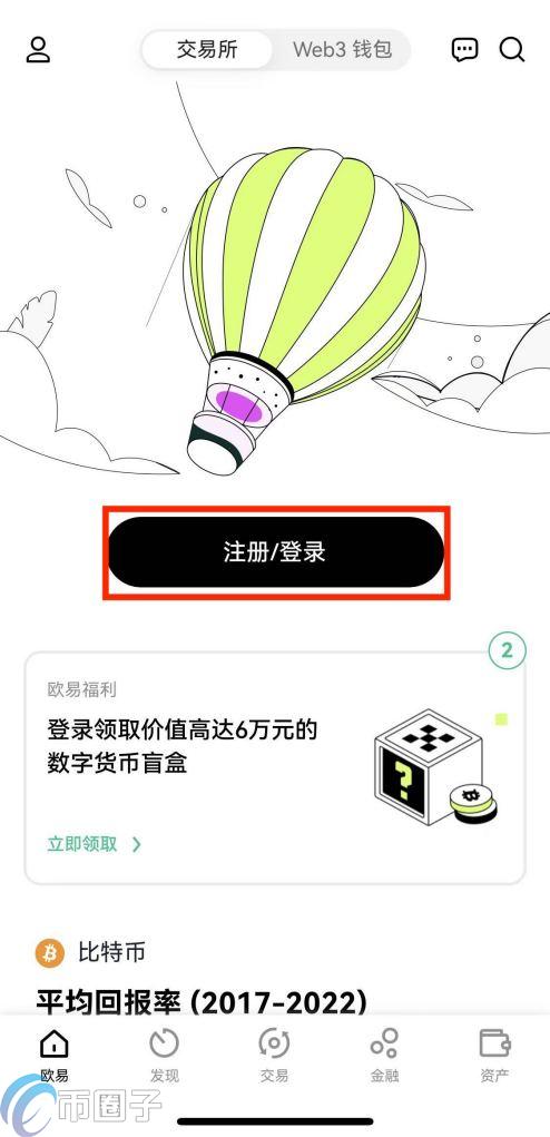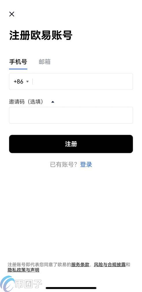 1.打开欧易APP,点击页面上方【注册/登录】,进入注册页面。