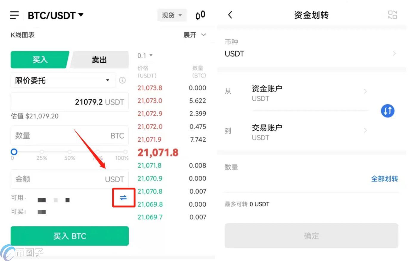 3.打开欧易APP通过【买币】区或者直接充值等方式获取USDT等基础货币。在交易页面点击资金划转按钮,选择划转的币种USDT,输入划转数量,将其划转至交易账户。
