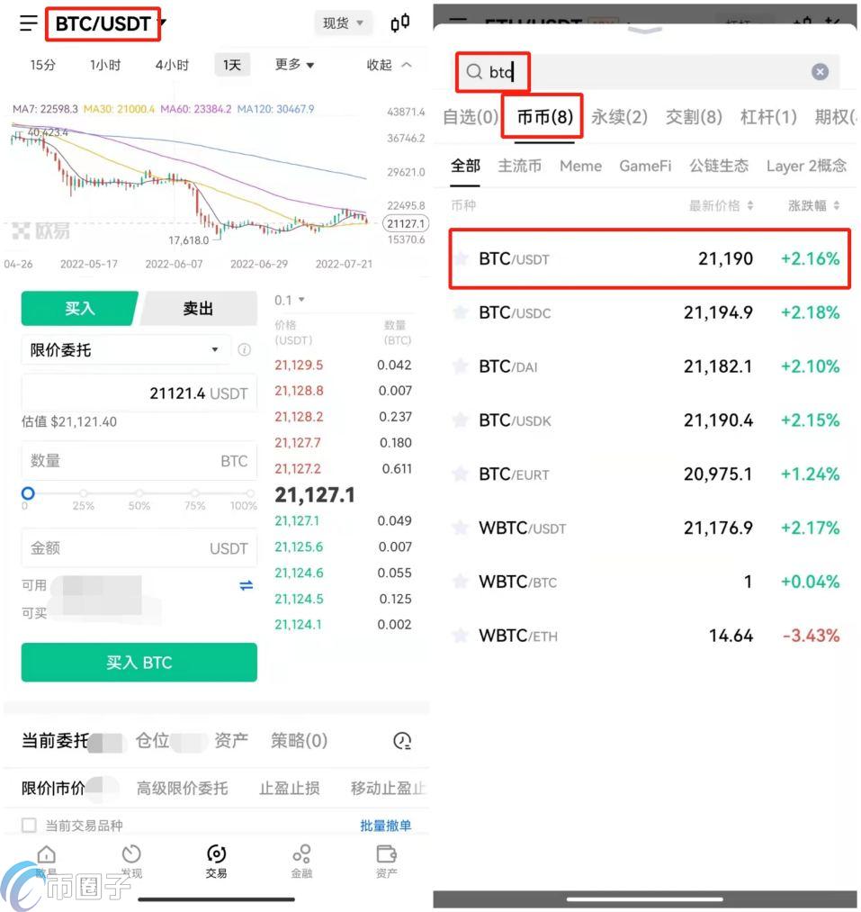 4.在首页下方点击交易,进入交易页面。点击页面上方交易对,在搜索框输入想要购买的币种 BTC,选择币币,点击相应币对 BTC/USDT。(若已在当前币对交易页面,可忽略此步骤)