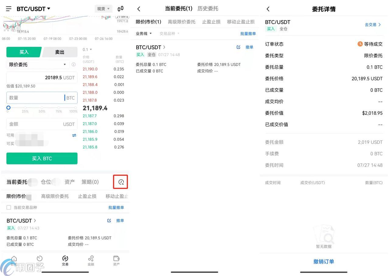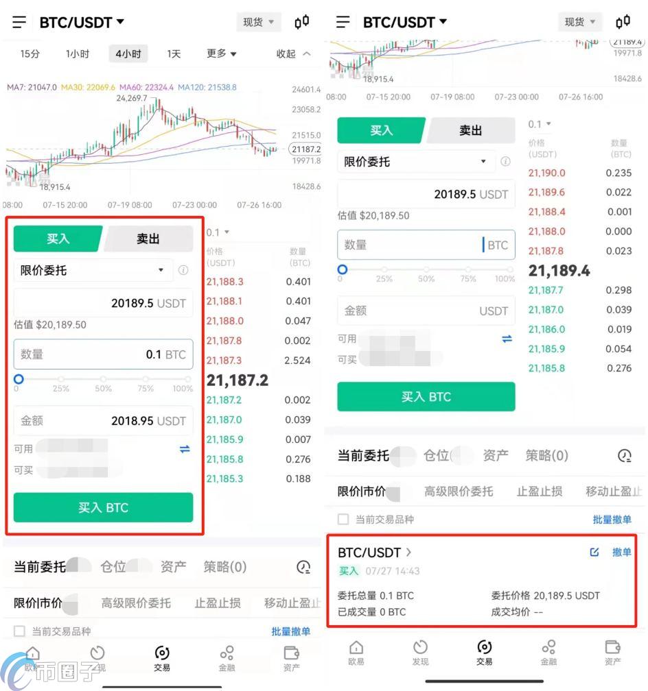 5.进入币对交易页面后,在买入界面,选择买入方式,输入买入价格、数量/金额,点击买入BTC即可。买入方式通常为限价委托,可以设置理想的价格进行购买。下单成功还未成交时,可看到委托单信息并可随时撤单。
