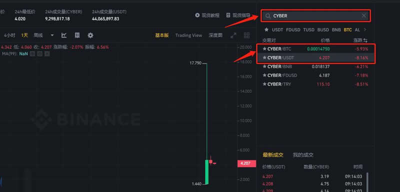7、搜索币种简称【CYBER】,选择【CYBER/USDT】交易对