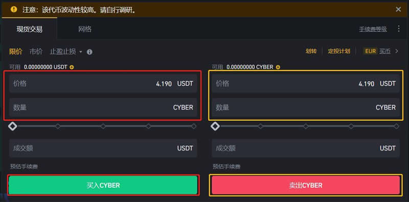 8、填写买入数量,点击【买入CYBER】即可完成CYBER币购买,填写卖出数量,点击【卖出CYBER】即可完成CYBER币交易